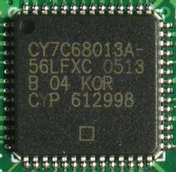 Работа с интерфейсом USB 2.0 осуществляется при помощи контроллера CY7C68013A от Cypress Semiconductor.