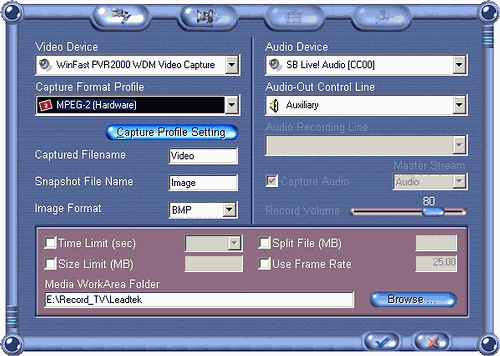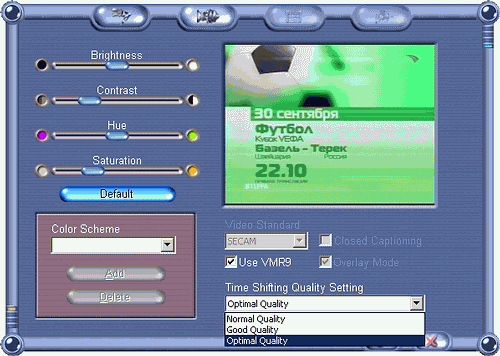 WinFast PVR обзавелся поддержкой VMR9. Кроме этого, в разделе Video Settings доступны настройки качества функции Time-Shifting. Загадочные Optimal Quality, Good Quality и Normal Quality скрывают всего-навсего разрешения 768×576, 640×288 и 384×288.