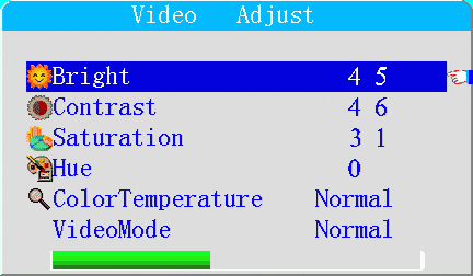 Раздел Video содержит настройки изображения (яркость контраст, цветность, оттенок) и нечасто встречающийся выбор цветовой температуры (нормальная, тёплая, холодная). В наличии 3 стандартных профиля (нормальный, яркий, мягкий) и пользовательский. Неплохо для бюджетной модели. Настройки применяются ко всем каналам одновременно.