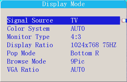 Раздел Display Mode содержит выбор источника сигнала, стандарт цветности (предусмотрено корректно работающее автоматическое определение), соотношение сторон и разрешение монитора (изменение разрешения также доступно при помощи кнопки MODE на пульте ДУ), позицию окна в режиме PIP (Picture In Picture, «Картинка в картинке») и количество ячеек в матрице многоканального предварительного просмотра (4, 9, 16).