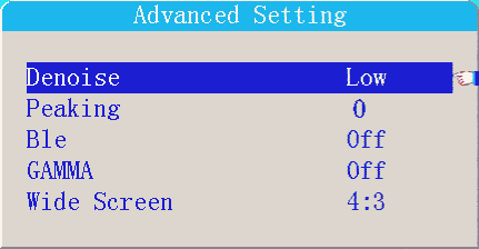 Можно выбрать один из 4 уровней шумоподавления (забавный нюанс — в тестовом экземпляре настройки оказались перепутаны, HIGH соответствовал OFF, OFF — LOW, LOW — MIDDLE, MIDDLE — HIGH, в официально поставляемых тюнерах это должно быть исправлено). Пункт Peaking отвечает за резкость. Аббревиатура Ble расшифровывается как Black Level Extension, включение этой опции должно влиять на уровень чёрного при использовании LCD-дисплея, однако обнаружить заметную разницу при тестировании не удалось. Возможна дополнительная гамма-коррекция (CD, CRT, Bright, Off). Пункт Wide Screen позволяет выбирать пропорции при использовании широкоформатного монитора (полноэкранный режим и принудительная установка 4:3 без искажений).
