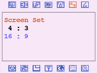 Пропуская раздел, отвечающий за сброс настроек, попадаем в меню выбора соотношения сторон. В полном соответствии с заявленными возможностями, доступны 4:3 и набирающее актуальность в связи с распространением широкоформатных дисплеев 16:9.