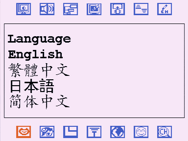 Нижний ряд начинается с выбора языка. Кроме трёх азиатских, поддерживаются английский, французский, немецкий, испанский. Русский вариант отсутствует.