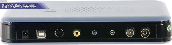 На передней панели находятся: ИК-датчик, индикаторы режимов работы (зеленый, желтый и красный соответственно) и кнопка включения/выключения тюнера. Отметим, что WinFast TV USB II является вторым после DVD2Go MPB680 попавшим к нам тюнером с интерфейсом USB 2.0, имеющим возможность физического выключения.