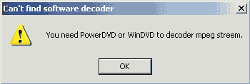 Раздел качества мы сегодня, пожалуй, начнем не со скриншотов. Дело в том, что для декодирования входящего потока используется программный декодер, так что Power DVD и DVD Plus, в данном случае, являются не просто дополнением, а суровой необходимостью. Не обнаружив в системе ни одного декодера (вероятность встретить такую систему в настоящее время не очень велика), DVD Encoder при запуске выдает вот такое предупреждение.