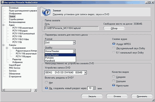 Pinnacle не устаёт удивлять. Пожалуй, впервые в ПО этой компании появилась возможность записи с применением сторонних кодеков. Кроме привычных предустановленных настроек (DVD/DVD_LONG/SVCD/VCD) MPEG1/2 (активация не требуется) в настройках захвата можно обнаружить DivX 6.0 (!), причём, кодек входит в состав программы (!!). Вот только выбор настроек компрессии пока ограничен имеющимися профилями. Имеется и возможность непосредственной записи на DVD.