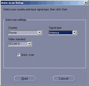 При первом запуске предлагается выбрать страну, диапазон и запустить поиск каналов.