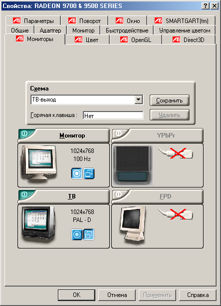 Карты RADEON обладают очень богатыми возможностями в плане ТВ-выхода. К сожалению, сейчас полноценное их использование несколько затруднено частично неудобными настройками, частично отсутствием «идеального» плеера. Хотелось бы иметь возможность сохранять в схемы не только настройки, изображённые на рис. 5 и разрешения, но и настройки ТВ-выхода (используемый стандарт, положение на экране и т. д.). И, конечно же, хотелось бы иметь проигрыватель, который бы сам переключал настройки ТВ-выхода для получения оптимальных результатов просмотра на ТВ.
