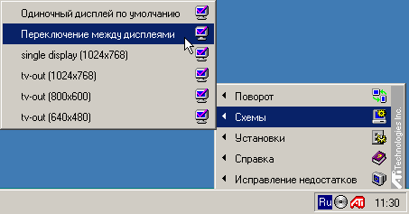 Рис.7. Использование значка ATI на панели задач для смены схемы. Нажав кнопку с надписью «ТВ» (TV) (на рис.6 она выделена жёлтой стрелкой), вы попадёте в настройки параметров ТВ-выхода: