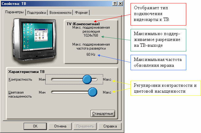 На рисунке выше вы видите панель «Параметры» (Attributes). На ней выдаётся информация о типе подключения видеокарты к ТВ, максимальные разрешение и частота обновления экрана, поддерживаемые при выходе на ТВ. Кроме того, вы можете изменить настройки контрастности и цветовой насыщенности.