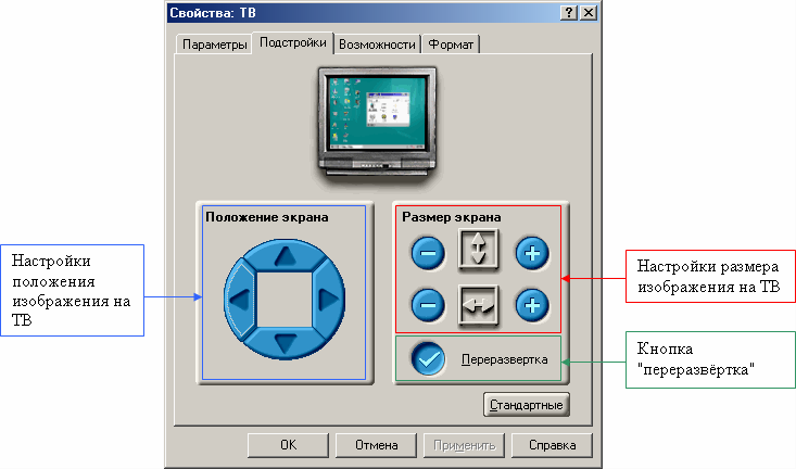 - Кнопка «переразвёртка» (overscan) включает переразвёрку при выводе на ТВ одновременно для всех разрешений. В этом режиме изображение растягивается на весь экран ТВ, однако края изображения могут быть «обрезаны». Наилучших результатов можно добиться для систем NTSC-M и NTSC-J в разрешении 640×480 (и 720×480), а для PAL 625/50 — в 800×600. При этом в последнем случае изображение будет достаточно ощутимо обрезано снизу (останется только несколько пикселей от стандартного таскбара), и, возможно, внизу экрана ТВ вы всё же увидите чёрную полосу. Попробуйте так же поиграться с нестандартными разрешениями (подробнее об этом читайте в 5-й части данной статьи).