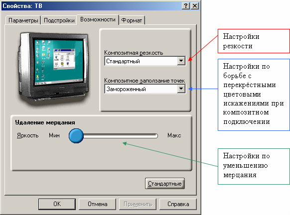 - При композитном соединении возникают перекрёстные цветовые искажения на мелких объёктах. Они напоминают «сеточку». Настройка «композитное заползание точек» (Composite Dot Crawl) позволяет несколько менять характер поведения этой «сеточки». При выборе в этом меню «Стандартный» (Standard) вы будете наблюдать движущуюся «сеточку», при выборе «Замороженный» (Frozen) — в системах NTSC «сеточка» остановится, в системах же PAL она будет двигаться очень быстро. В справке ATI по этому параметру рекомендуется первый вариант (Standart) использовать для фильмов, а второй (Frozen) — для работы со статическими изображениями. Однако в режимах PAL не имеет ни малейшего смысла следовать этой рекомендации, так как «сеточка» при выборе второй опции «не замораживается».