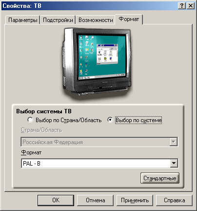 На панели «Формат» (Format) вы можете выбрать формат сигнала, выводимого на ТВ. Из стандартов NTSC-M и NTSC-M(JAPAN) предпочтительнее последний. При подключении по S-Video из всех стандартов PAL 625/50 лучше выбрать PAL-D, так как с ним вы получите большую чёткость по горизонтали из-за более широкой полосы пропускания (6 МГц). После смены стандарта вам будет предложено перезагрузить компьютер. Однако этого можно не делать, так как если вы измените разрешение, то в этом случае стандарт точно переключиться на выбранный вами. Ещё одна особенность — при использовании стандарта, обозначенного как PAL K1 (это, предположительно, PAL-60), у вас могут возникнуть проблемы, выражающиеся в «подвисании» компьютера. Так что лишний раз подумайте, прежде чем пытаться его использовать.