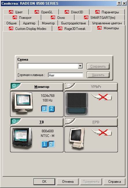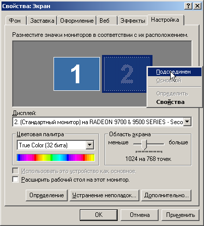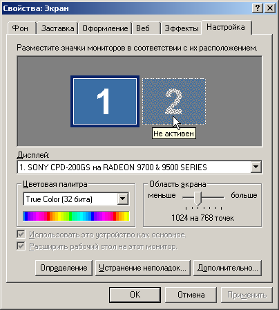 Если вы используете «двухголовую» видеокарту, то в случае использования Windows 98/ME и XP, а также Windows 2000 вместе с картами RADEON 9500/9700 вы увидите следующую (или похожую) картину при заходе в свойства экрана: