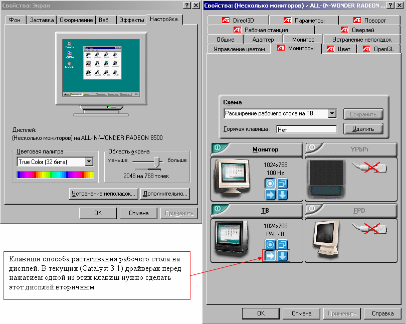 Вторым после режима «клон» для просмотра видео стал использоваться режим расширения рабочего стола на ТВ, имеющий все плюсы режима клон. И сразу хочу предупредить, что этот режим совершенно не подходит для пользователей карт RADEON 9500/9700, использующих Windows 2000 (по крайней мере, сейчас). Причина проста — в этом режиме оверлей в принципе не включается. Возможно, что в будущих драйверах это будет исправлено.