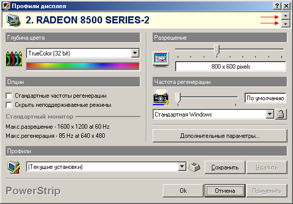 На рис.19 показаны настройки PowerStrip. Обратите внимание на кнопки, выделенные стрелками — с их помощью вы можете выбрать первичный или вторичный дисплей, однако перед этим включите режим расширения рабочего стола. Нажав на кнопку «Дополнительные параметры», вы попадёте в ещё одно меню, в котором нажмите кнопку Другие разрешения…».