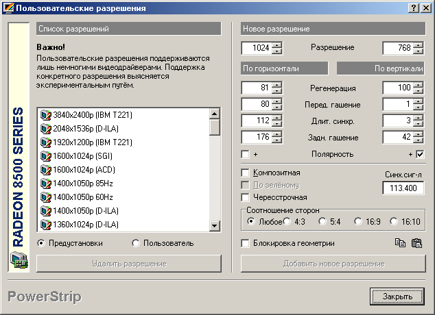 Как можно добавить требуемое разрешение? Для этого удобнее всего воспользоваться программами Rage3Dtweak или PowerStrip. Последняя программа может добавить новое разрешение и на вторичный дисплей. Рассмотрим их по отдельности, но сначала я приведу список нестандартных разрешений, поддерживаемых ТВ-выходом: