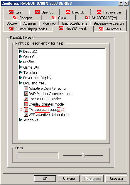 На рисунке выше приведена старая панель «Окно» (Overlay; когда же это название в ATI правильно переведут на русский?). Для включения режима поставьте галочку в чекбоксе, обведённом овалом. Как вы видите, настройки минимальны. При воспроизведении фильма на ТВ будет автоматически выбираться разрешение из доступных режимов между 640×480 и 800×600 в зависимости от разрешения фильма (а точнее размера оверлея) так, чтобы, по возможности, не делать масштабирования вниз (то есть не уменьшать размер фильма) изображения. В случае если у вас имеется карта RADEON 8500/9100 с нераспаяным вторым RAMDAC, разрешение на ТВ будет таким же, как и на мониторе. В какой-то степени выбор разрешения можно ограничить, форсировав частоту обновления экрана в некоторых из них больше, чем 60 Гц.
