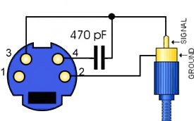 В случае если же вместо 7-контактного S-Video разъёма имеется только 4-контактный, то можно использовать универсальную любительскую схему с конденсатором. Такое подключение даёт худшее качество по сравнению с «чистым» композитным сигналом. Хочу особо отметить, что переходники S-Video>RCA от других карт совершенно не подходят к картам RADEON, разве что в них используется смешивание яркостного (Y) и цветового (C) сигналов при помощи конденсатора.