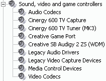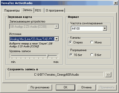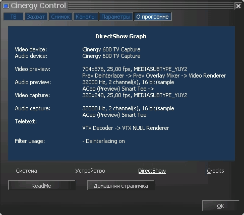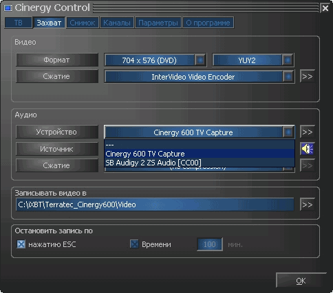 При записи разрешается использовать встроенный АЦП SAA7134HL для захвата звука по шине PCI, выбрав в качестве источника звука Cinergy 600 TV Capture. Имеется и заявленная в спецификациях поддержка сторонних кодеков.