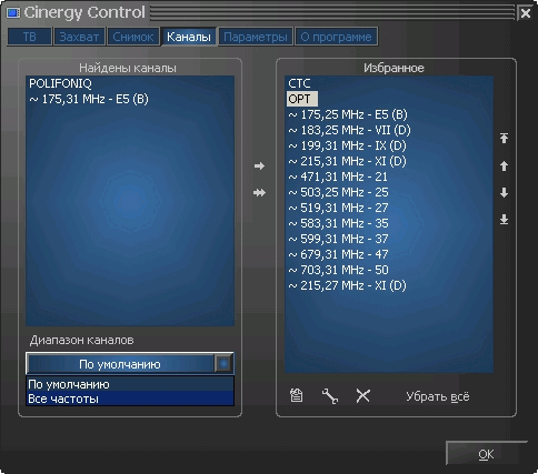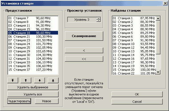 Поиск каналов осуществляется как по диапазону в соответствии с выбранными региональными установками, так и по частоте с шагом 0,125 МГц. Возможен и ручной ввод частоты.