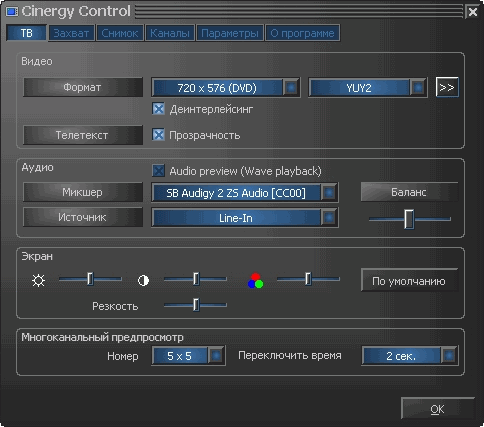 В разделе ТВ находятся видео- и аудионастройки. Максимальное поддерживаемое разрешение составляет 720×576. Тут же находятся и настройки многоканального предварительного просмотра. Похоже, что в программе реализован Bob-деинтерлейс, отличающийся невысокой загрузкой ЦП. К сожалению, этот алгоритм нельзя назвать самым качественным среди существующих.