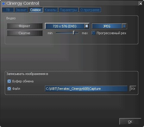 Галерея скриншотов отсутствует. Захват кадра возможен только в bmp и jpeg. При этом настраивается не качество, а степень jpeg-компрессии, то есть крайнему левому положению ползунка соответствует максимальное качество и наоборот.