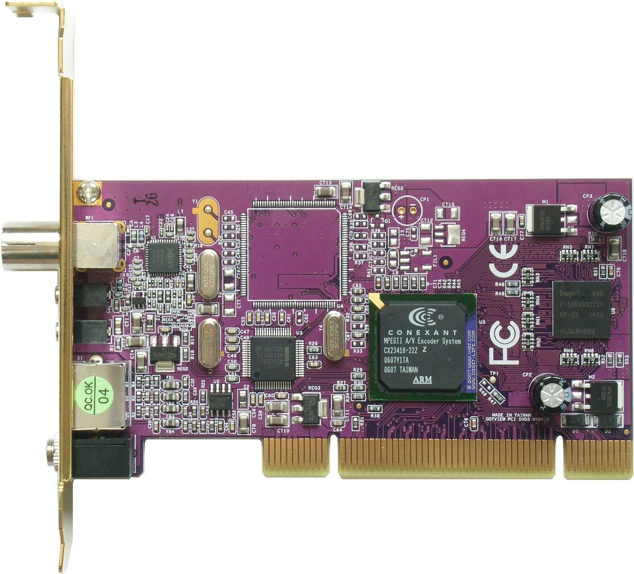 Гибридный TV- и FM-тюнер GOTVIEW PCI DVD3 Hybrid в настоящее время является единственным на российском рынке устройством этого класса с поддержкой аппаратного сжатия в MPEG1/2. Полупроводниковый селектор Xceive XC3028, АЦП+MPEG1/2-энкодер Conexant CX23418, COFDM демодулятор Intel CE 6353.