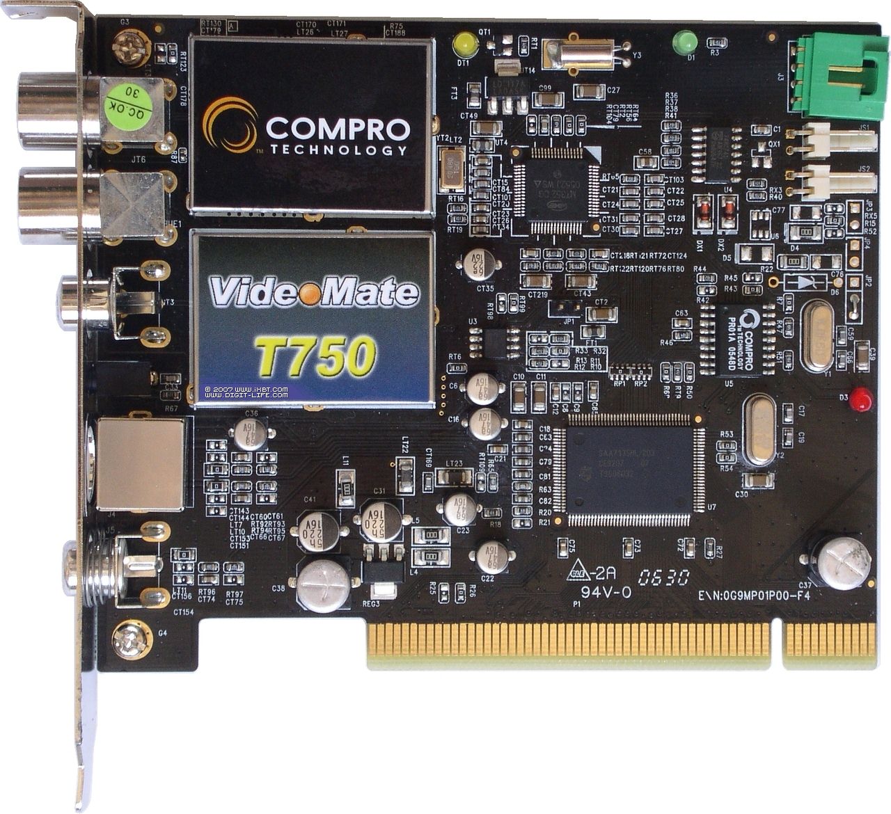 Compro VideoMate T750 — гибридный TV- и FM-тюнер с двумя независимыми приёмниками. Аналоговый селектор Xceive XC2028, цифровой Quantek QT1010, 9-битный АЦП Philips SAA7135HL/203, COFDM демодулятор Zarlink MT352.