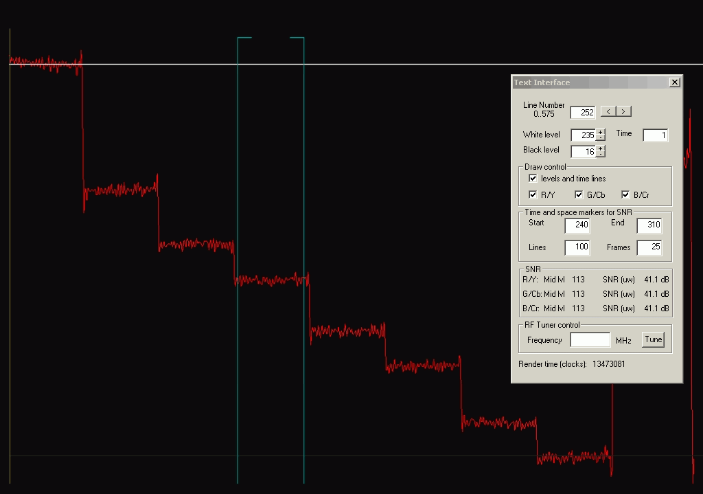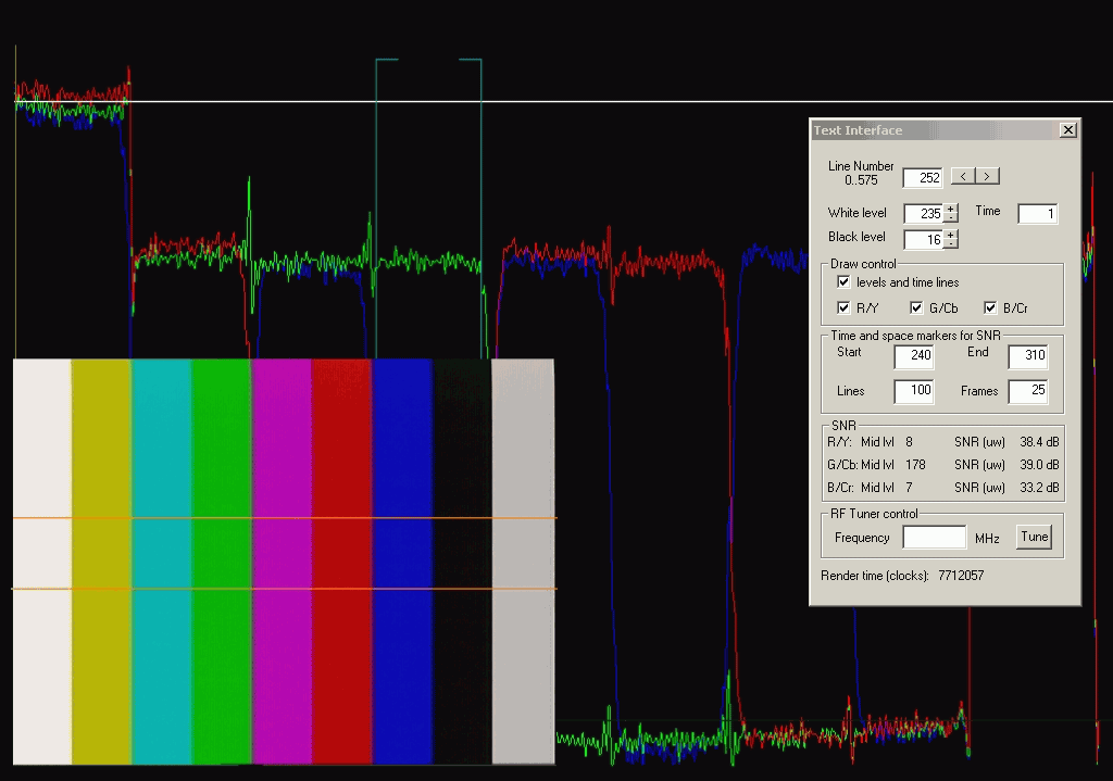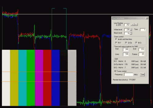 В качестве источника сигнала использовался генератор испытательного сигнала «Муссон-007». Тестирование проводилось в стандарте PAL, чтобы исключить влияние АЦП при работе с SECAM.