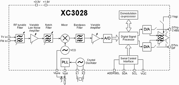 Для приёма сигнала служит гибридный полупроводниковый ВЧ-блок Xcieve XC3028.