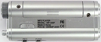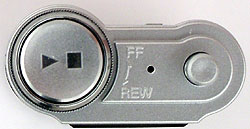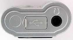 Сверху можно обнаружить орган управления, который будет использоваться наиболее часто — кнопку Play/Pause, окруженную поворотным колечком для перемотки и перехода между треками или навигации в меню. Рядом находится «пенек» для крепления шнурка-«ошейника». На мой взгляд, такой вариант ношения плеера будет не совсем удобен (хоть он и весит всего 30 г без элемента питания), поскольку разъем для наушников, вместе с USB-портом, помещается на нижнем торце, т.е. прямо напротив крепления для шнурка. Впрочем, подобные модели лучше всего чувствуют себя в кармане :)