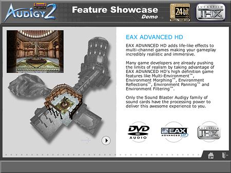 Имеется даже 3D графическое демо, где можно погулять в трёхмерности по средневековому замку, послушав эффекты EAX3 в реальной работе и покрутив параметры.