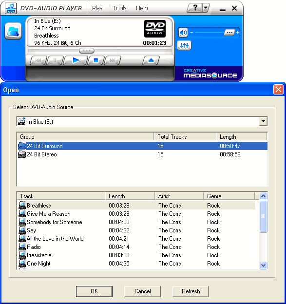 Очень интересно было сравнить один и тот же диск в старом формате CD-DA против нового DVD-Audio. Ирландская группа «the Corrs», играющая в стиле поп-рок с элементами этно. Альбом «In Blue», 143 Records/Atlantic Recording.