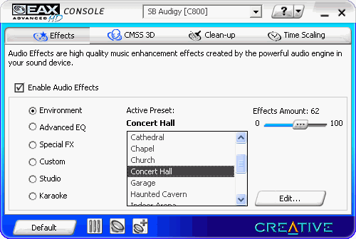 Специальные настройки EAX AdvancedHD вынесены в одну группу. Эффекты не претерпели изменений со времени Audigy.