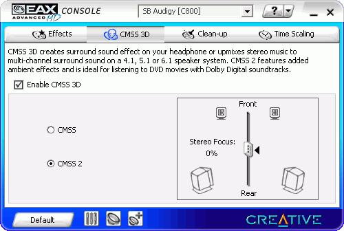 Технология распределения стереозвука на 4-, 5.1- и 6.1-колоночные конфигурации, CMSS (Creative Multi Speakers Surround), наконец-то выделена из пресетов, вроде Movie Mode, в отдельную категорию. Более того, добавлен режим CMSS 2, который отличается добавлением небольшого количества реверберации.