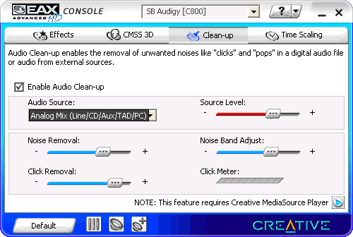 Очистку записей от шумов, Clean-up, можно активизировать как для внешнего источника (при записи), так и при воспроизведении зашумлённых фонограмм.