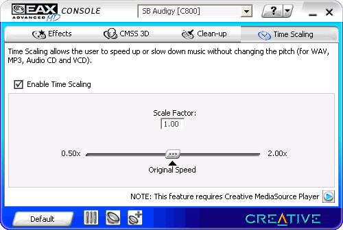 В наборе EAX AdvancedHD также присутствует возможность ускорять и замедлять воспроизведение без изменения высоты тона, time-scaling.