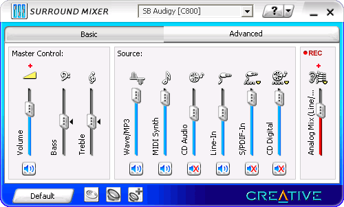 Старый добрый Surround Mixer позволяет отрегулировать громкость физических каналов карты. Баго-фича с невозможностью записи с линейного входа без включения мониторинга воспроизведения осталась ещё со времён Audigy.