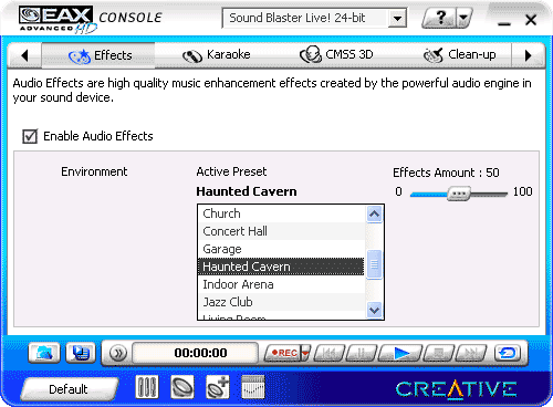 Караоке — дань моде… Эта функция есть и на встроенной Realtek ALC650. Хотя здесь настроек больше, плюс можно наложить эффект на микрофон. Работает несколько ущербно. Левая часть Voice Suppression amount и Pitch работают только с Creative MediaSourse Player. Включение/отключение эффекта требует примерно 5 секунд задержки. На голосовое подавление — 3 разных режима, из них два с регулировкой. Pitch меняет тон мелодии. На ревербацию, накладываемую на микрофон, доступно огромное количество пресетов. Для того чтобы ее услышать, нужно выбрать микрофон на запись (что панель делает автоматически), а в source микрофон отключить. Включение/отключение эффекта мгновенно. Вместо микрофона Line-in или Auxliary подставить не удалось.