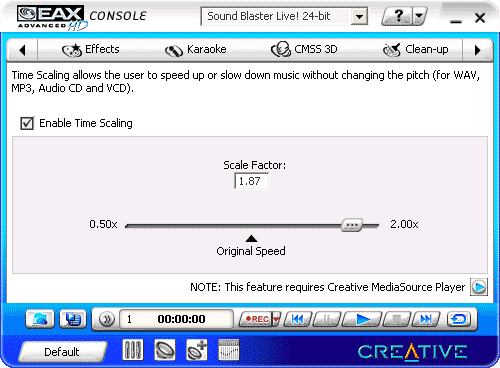 А вот что по настоящему интересно — Clean-up. Убираем шумы и щелчки с аудио записи. Изначально это предлагается использовать для винила, но дома это пригодится для FM-тюнера. Включение/отключение эффекта требует примерно 7 секунд задержки. Работает под любым плеером. В теории можно это накладывать на Media Files и на линейные входы. На практике — микрофон и Line-in, а Auxiliary, несмотря на возможность выбора, не обрабатывался. Работает очень эффективно. Это единственное, что переплюнуло NSP. Конечно, если поднапрячься, и поискать по интернету, то можно достать необходимый VST-плагин, но на данный момент у меня такого нет. И за Clean-up поставим карточке большой плюс!