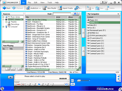 Основное окно программы имеет «попсовый» внешний вид в стиле Windows XP, который, с учетом ее функций, вполне уместен. Слева находятся окошко Sources, выбирающее содержимое центрального основного окна и текущий плейлист встроенного плеера (кнопки управления которым находятся в нижней части окна программы), справа дополнительная панель, похожая на центральную, но имеющая несколько ограниченную функциональность в частности, содержимое винчестера плеера в ней не отобразишь, да и поиск по имени файла не сделаешь. Кнопка внизу ее открывает окошко передачи файлов, которая выполняется асинхронно: т.е. выбираем файлы (или даже каталог со всеми его подкаталогами) или треки на аудиодиске, нажимаем кнопку для отправки их в плеер или библиотеку на компьютере, и продолжаем заниматься своими делами, пока оно переписывается.