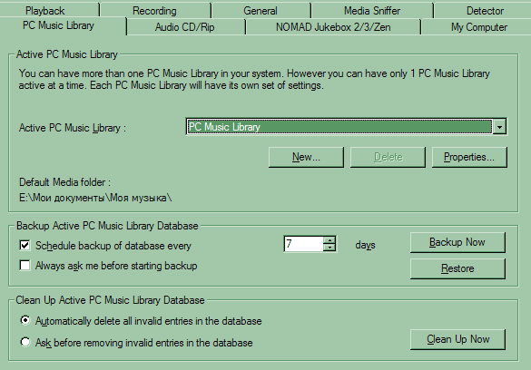 Первая закладка отвечает за работу с музыкальной библиотекой на компьютере. Точнее, библиотеками их может быть и несколько. Кроме совершенно очевидной настройки текущей библиотеки и ее места расположения, здесь же можно указать MediaSource на необходимость регулярного резервного копирования библиотеки или проверки ее целостности.