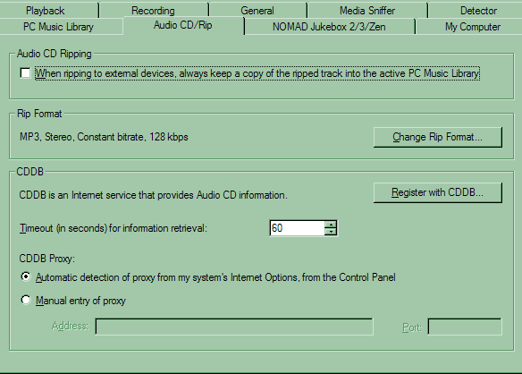 В библиотеку можно заносить не только готовые файлы, но и копировать аудиотреки с дисков. Вторая закладка как раз и управляет параметрами работы с треками. В принципе, поддерживается все необходимое, включая и работу с CDDB, но вот возможности встроенного аудиокомпрессора оставляют желать лучшего, особенно при работе с WMA-файлами как и в PlayCenter до сих пор поддерживается лишь версия V2. Таким образом, лучше все же использовать, по крайней мере, для сжатия продукцию сторонних фирм. Впрочем, очень многим пользователям вполне хватит и штатных средств.