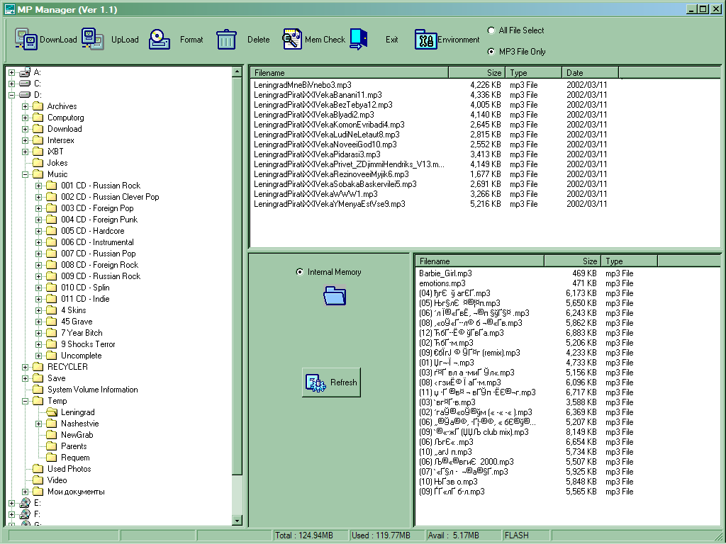 Однако не все ладно в Датском королевстве. Камнем преткновения являются русские буквы в именах файлов (что встречается и в других подобных программах). К счастью, MP Manager воспринимает их совершенно нормально и, как и положено, записывает в память плеера. Правда при этом название файла искажается (как — можете посмотреть на увеличенном скриншоте), причем необратимо: при переписывании файла обратно на компьютер все эти "кракозяблы" остаются на месте (это приводит еще и, например, к тому, что удалить или запустить такой файл при помощи FAR уже невозможно, хотя стандартный Explorer с ними работает). В принципе, если записывать файлы лишь изредка и, при этом, целиком обновлять все содержимое памяти, к проблемам это не приводит — плеер воспринимает их совершенно нормально. Однако если попытаться лишь частично обновить коллекцию… Вот как я могу понять, что скрывается под этим набором непонятных символов, глядя на менеджер? Остается только запоминать, какой по счету файл хотелось удалить для освобождения места, что, понятно, удобство использования сводит почти на нет. В общем, неприятно это, поскольку заставляет перегонять имена файлов в транслит, дабы ими можно было нормально пользоваться.