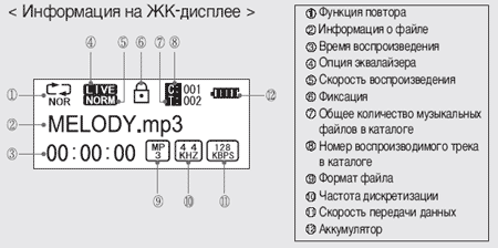 Как и положено плееру образца 2004 года, дисплей графический и достаточно информативный, правда, поскольку модель позиционируется как бюджетная, цвет подсветки остался один — синий. Впрочем, лучше один раз увидеть, чем сто раз услышать, так что привожу его схему (в режиме воспроизведения музыки — остальные проще и смотреть там особо не на что) из руководства пользователя:
