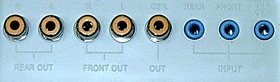 На тыльной стороне расположены выходы на тыловые (rear out), фронтальные (front out) и центральный (cen. out) спикеры. Как видно из фотографии, выходные разъёмы выполнены в виде тюльпанчиков (RCA) и имеют, к сожалению, одноцветную маркировку, так что при подключении шнуров требуется некоторая внимательность. Рядом же расположены 3 аналоговых стерео входа (INPUT): rear input, front input, sub./cen. input, с разъёмами мини-джек.