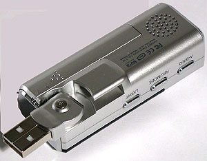 Несмотря на то, что перед нами именно плейдрайв, по размеру (74 × 30 × 21 мм) и массе (32,5 г. без батареи и 56,5 г. с батареей официально; хотя, вообще-то, элемент питания типа АА весит не 24, а 26 г., но это уже мелочи) устройство практически не превосходит своих коллег «просто плееров», несмотря на использование, мягко говоря, некомпактной батареи типоразмера AA. Весь секрет в необычном размещении USB-коннектора, который не закрывается крышкой как в обычных плейдрайвах, а «заворачивается» внутрь корпуса, что и обеспечивает удивительную компактность. Однако у этого подхода есть и обратная сторона: наличие лишней движущейся части явно не пойдет на пользу долговечности устройства.