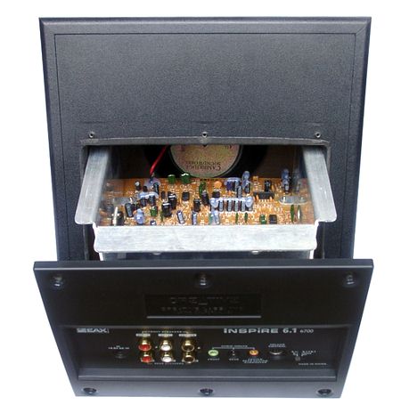 Ближайший родственник комплекта наборы активной акустики без декодера 5000-й серии (например Inspire 5.1 5300). По сравнению с ними, в 6700 чуть более мощный усилитель, проводной пульт ДУ с выходом на наушники, а также добавлен тыловой сателлит, представляющий собой точно такой же спикер, как и фронтальные с тыловыми. Паспортная мощность набора немного увеличилась. Теперь это 22 Вт RMS для сабвуфера, 20 Вт RMS для центра и 8 Вт RMS на каждый из остальных каналов. Мы уже неоднократно говорили, что указываемая в таких случаях мощность это мощность усилительных микросхем, измеренная на эквивалентном электрическом сопротивлении, при достижении определённого процента искажений. Так как подобная характеристика не имеет прямой связи с громкостью звука, так что мы не будем останавливаться на приведённых в спецификации цифрах, сочтя их типичными для акустики такого класса.