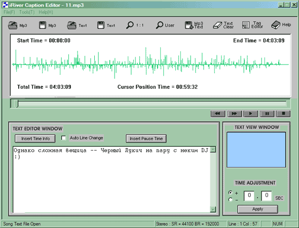Функции Caption Editor несколько шире, чем банальный редактор тэгов это полноценный редактор Lyrics3. Найдя такую программу в комплекте с плеером, я сильно обрадовался решил, что он, наверное, способен отображать текст песни. Однако, к сожалению, сам плеер пока стихи игнорирует (в отличие от MP3/CD этой фирмы), так что обработанные CE файлы на данный момент полезны лишь для использования на компьютере с соответствующими плеерами.